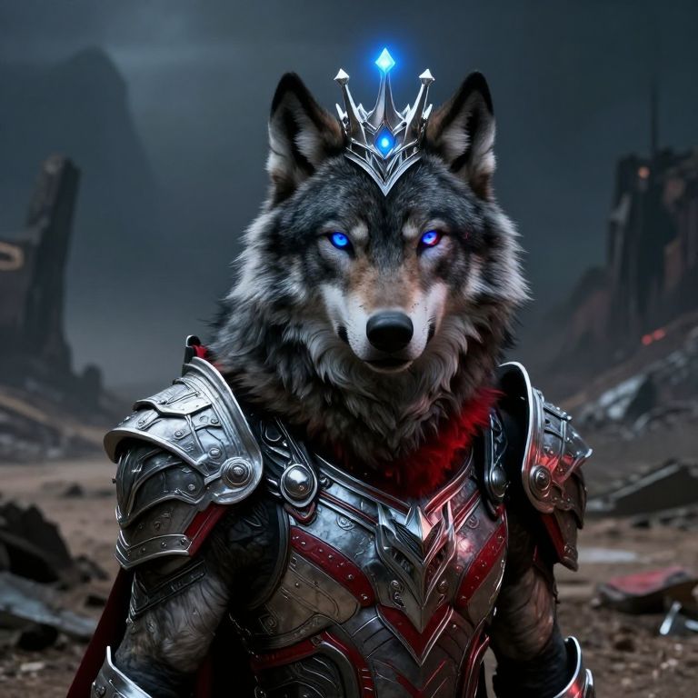 In the year 2050, within a cyberpunk wasteland, a wolf king stands regally, adorned with intricate silver accessories and a glowing silver crown. His eyes, a mesmerizing blend of blue and red, gaze over the desolate landscape. The wolf's fur is a rich, dark gray, with a hint of red on his chest, adding a touch of wildness to his otherwise refined appearance. The crown, a masterpiece of silver craftsmanship, rests atop his head, casting a radiant blue light that illuminates his face. The wolf's body is covered in detailed armor, with red and silver accents that shimmer in the dim light. The background, a vast expanse of barren land, is dotted with scattered ruins and distant mountains, creating a stark contrast with the wolf's imposing presence. The overall composition is cinematic, with the wolf positioned centrally, drawing the viewer's eye to his regal stature and the intricate details of his attire. The interplay of colors, textures, and shapes creates a visually striking image, capturing the essence of a cyberpunk world where nature and technology coexist.