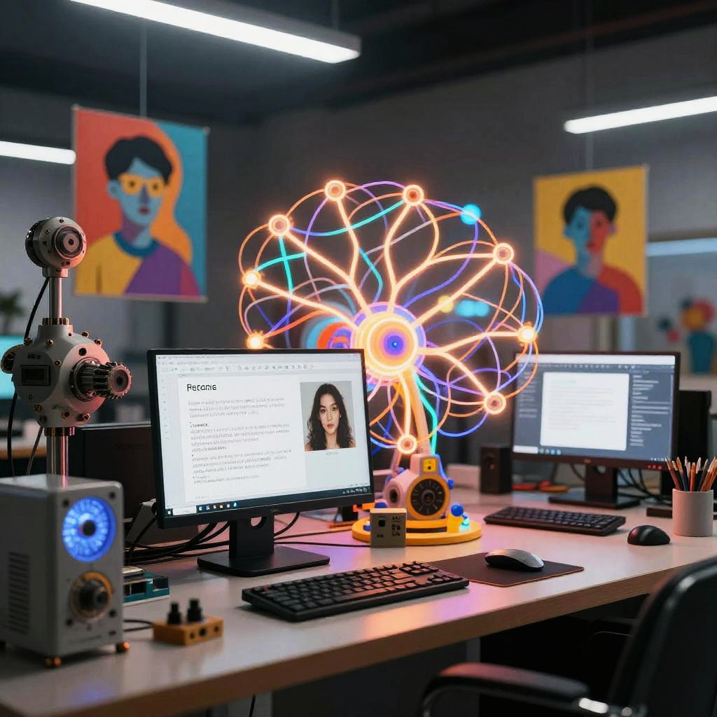 Img 2 prompt depicted as a surreal digital workshop where AI constructs prompts from images, vibrant colors with abstract elements, glowing neural networks woven through mechanical devices, capturing the essence of creativity and technology merging