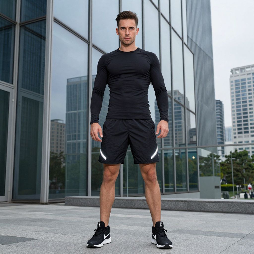 "a man, fitted long-sleeve compression top, black stretch shorts, reflective accents, high-performance sneakers, modern glass structure, bustling city skyline, sleek lines, lithographic film style, focused expression Man has masculine face and piercing eyes"