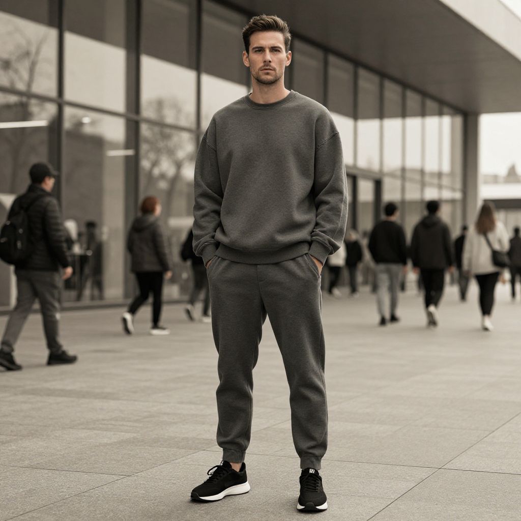 A man, charcoal gray tapered joggers, oversized crewneck sweatshirt, soft fleece material, sleek black trainers, modern architecture, large glass windows, bustling shoppers, sepia effect, relaxed expression, hands in pockets. Man has masculine face and piercing eyes