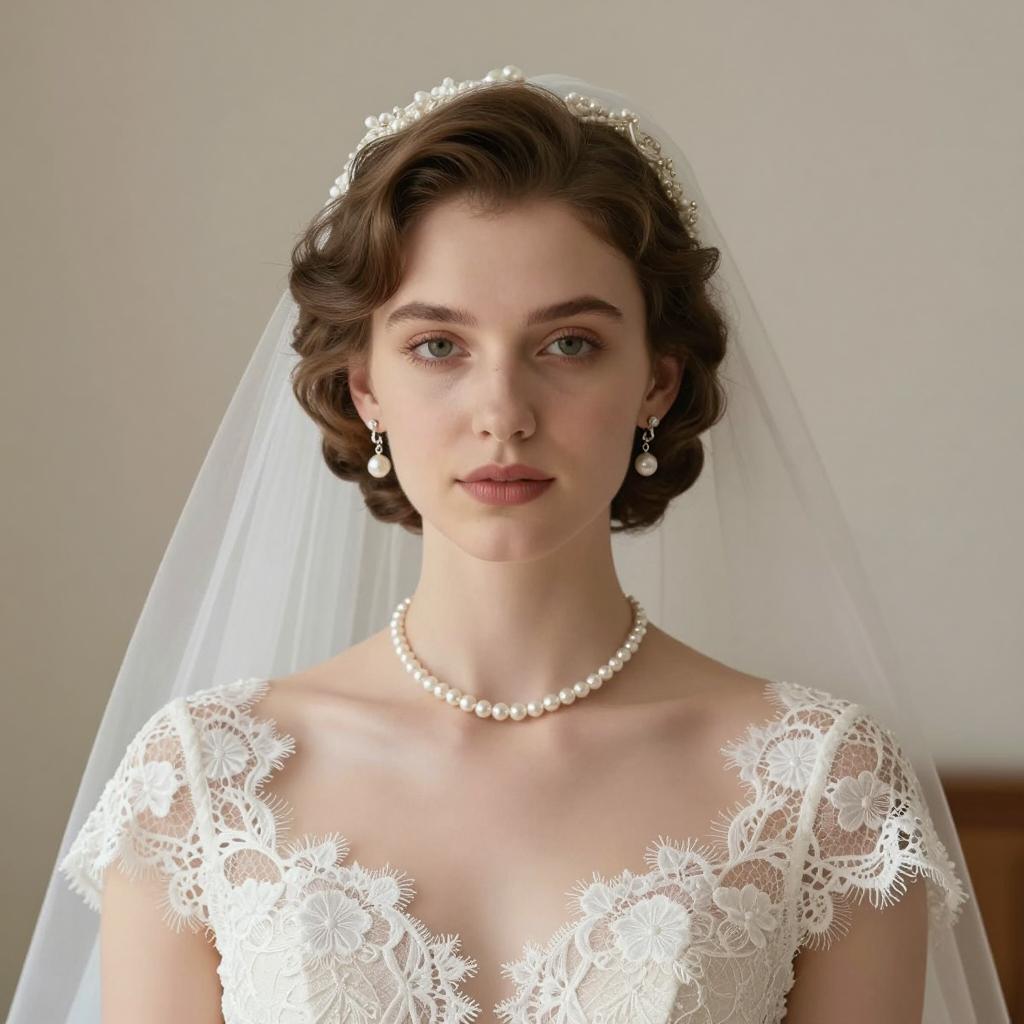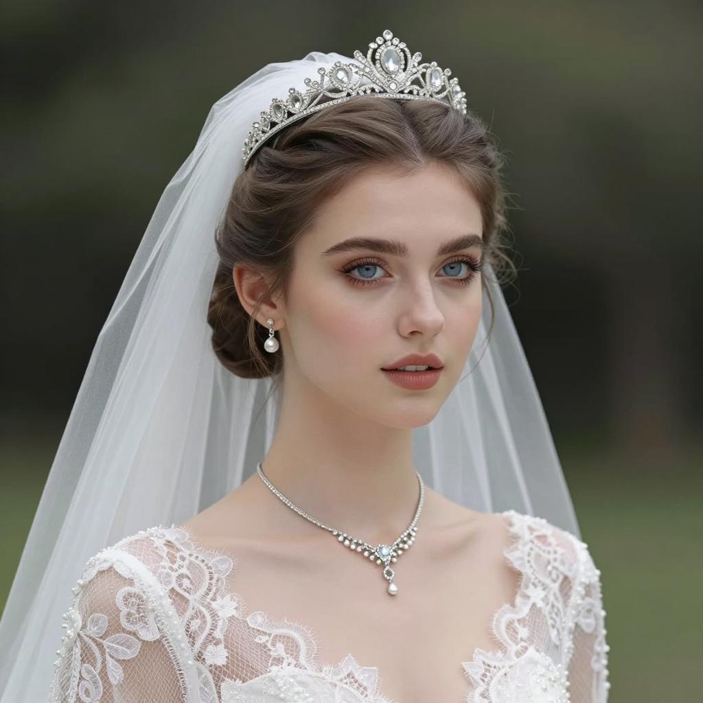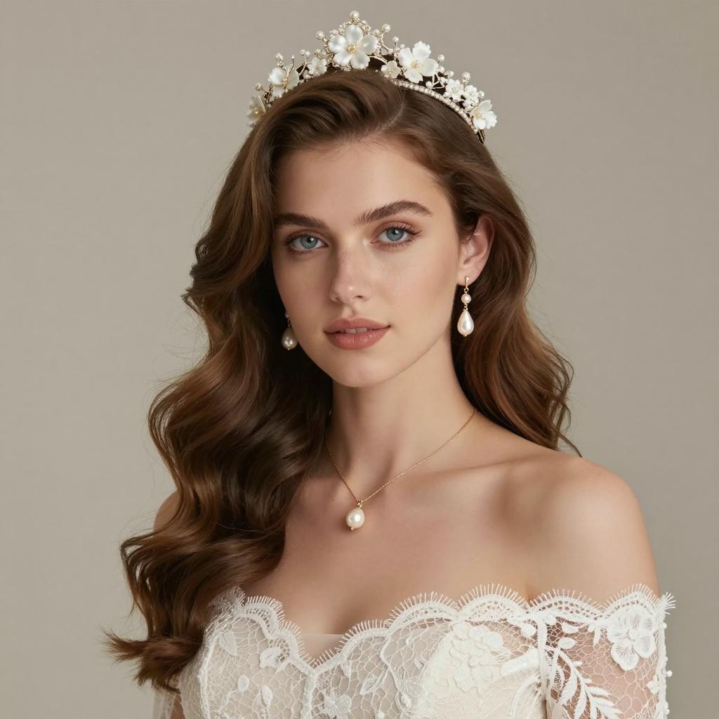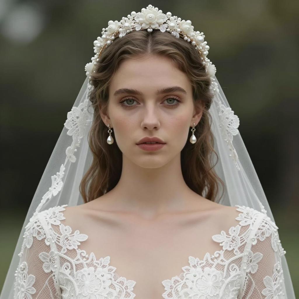 Bridal style, photorealistic portrait of a beautiful young woman, light skin, brown wavy hair, wearing a delicate floral tiara and a white lace wedding veil, green eyes, wearing matching lace wedding dress with intricate floral patterns, dangling pearl earrings, soft natural light, blurred greenery background, serene expression, close-up, focus on face, realistic ure, romantic and elegant style, shallow depth of field, soft light, detailed lacework