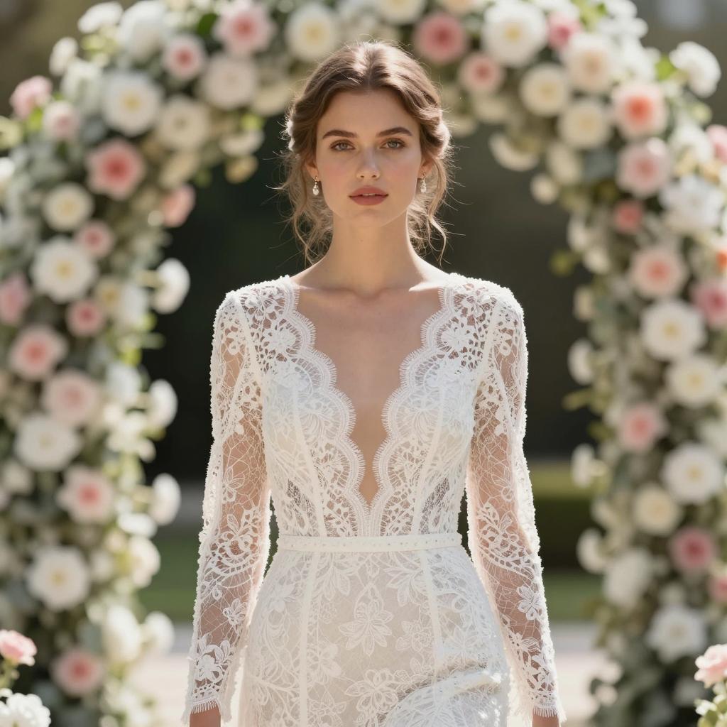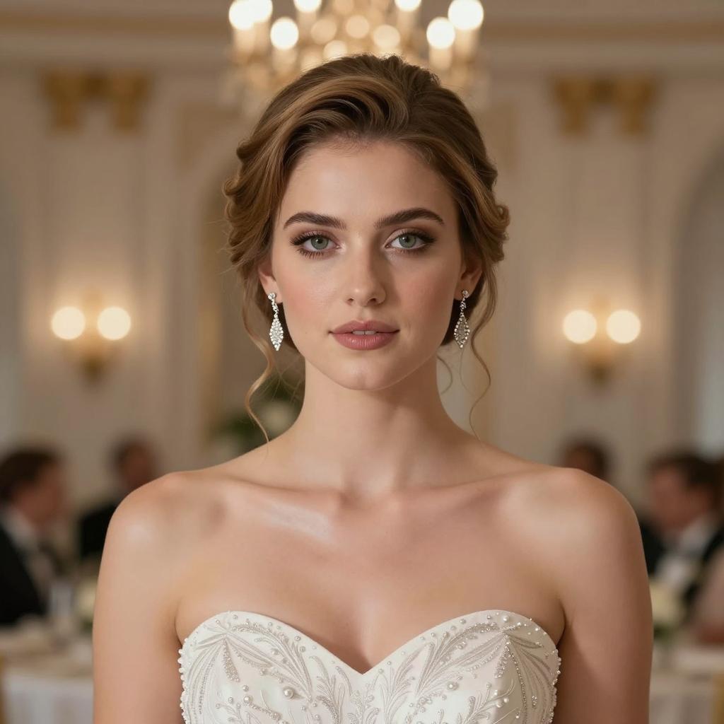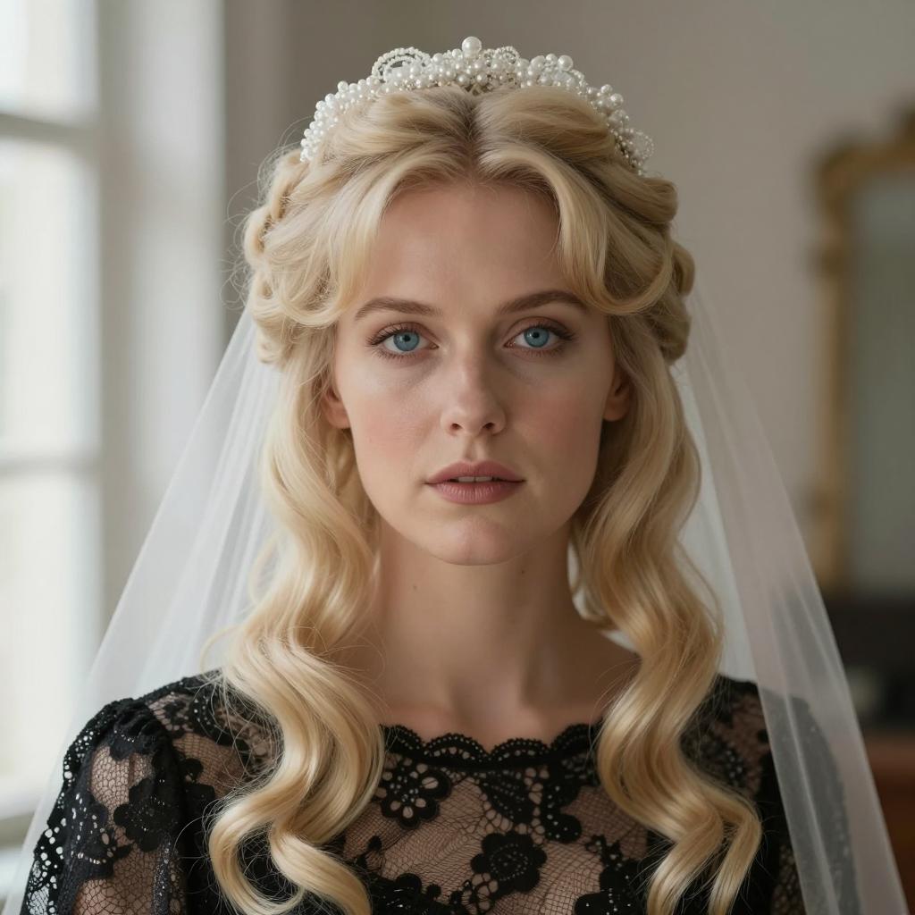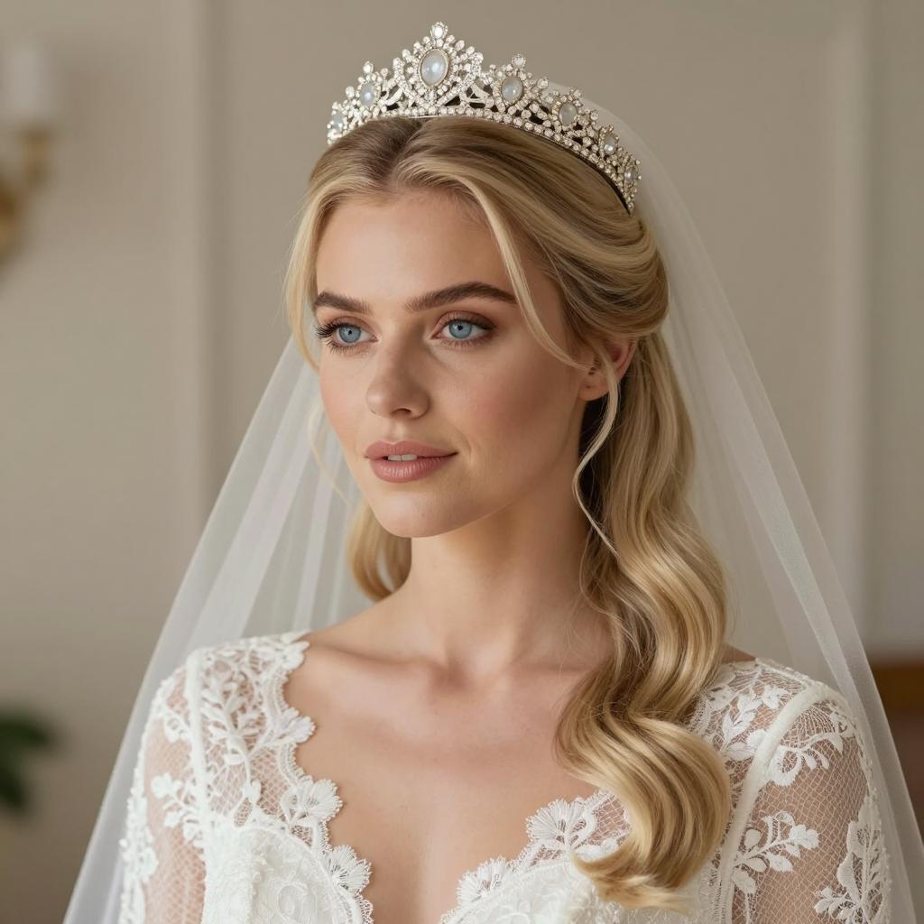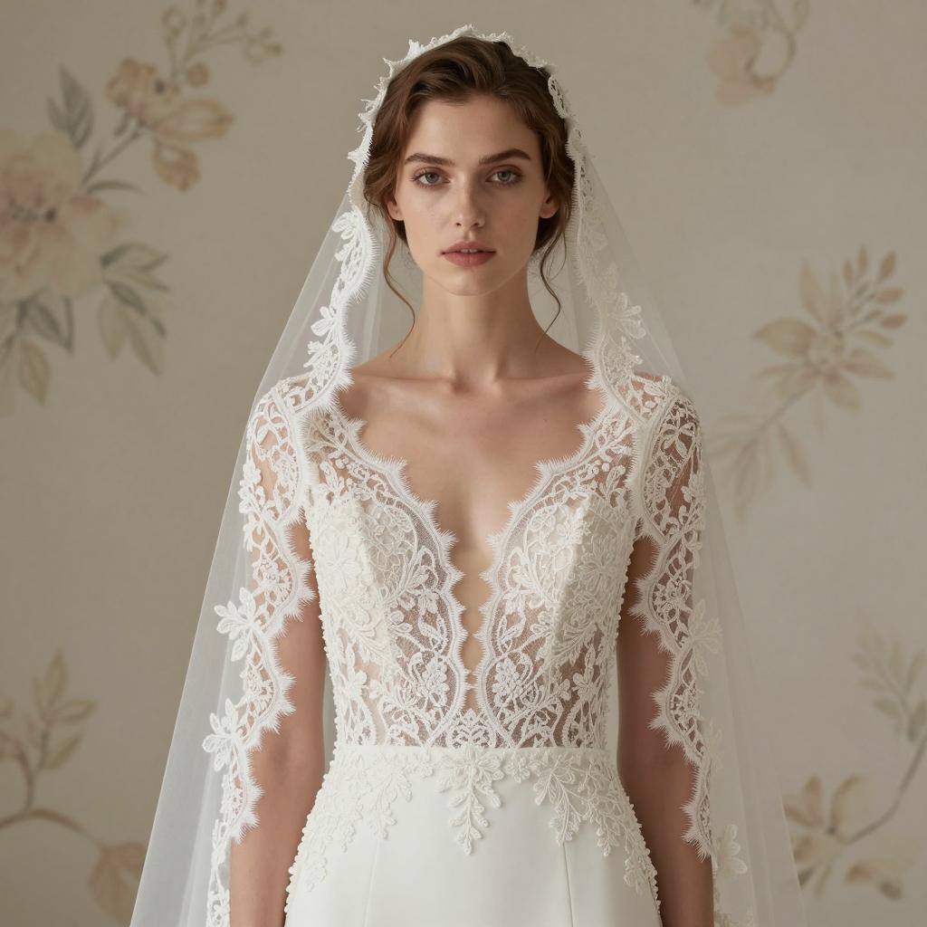 Bridal style, photorealistic portrait of a beautiful young woman, light skin, brown wavy hair, wearing a delicate floral tiara and a white lace wedding veil, green eyes, wearing matching lace wedding dress with intricate floral patterns, dangling pearl earrings, soft natural light, blurred greenery background, serene expression, close-up, focus on face, realistic ure, romantic and elegant style, shallow depth of field, soft light, detailed lacework