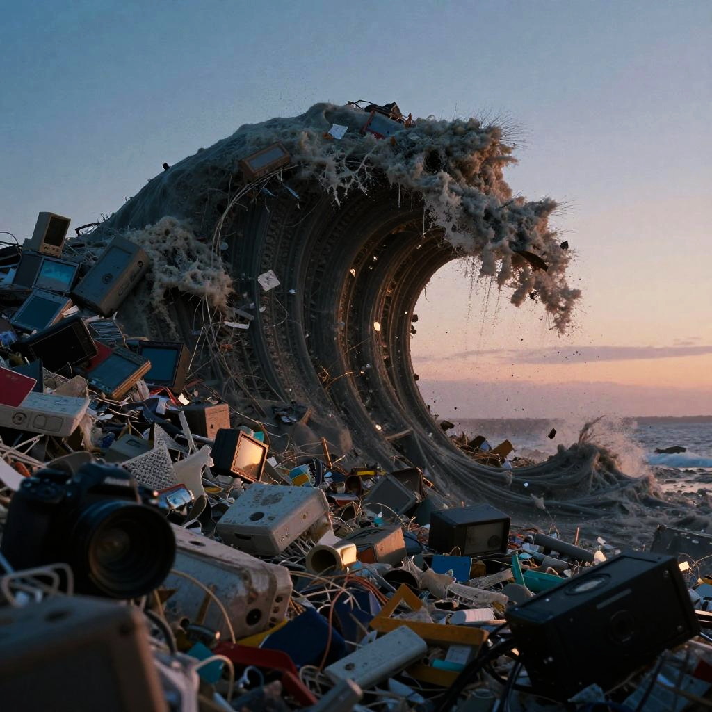 Dvr-trsh, a colossal dystopian dark waste wave made of dvr-trsh, waste and debris bearing down upon the viewer. Illuminate the need for environmental awareness and action through the lens of this powerful bleaked moody image.during a beautiful sunrise, drmbgg, OverallDetail, very detailed, raw photo, a blue sunset landscape, photorealistic, high detailed texture, 8k uhd, dslr, soft lighting, high quality, film grain, highly detailed photography, Film grain, cinematic film still, shallow depth of field, highly detailed, high budget, cinemascope, moody, epic, gorgeous, 2000s vintage RAW photo, candid camera, color graded cinematic, atmospheric lighting, skin pores, imperfections, natural, shallow dof