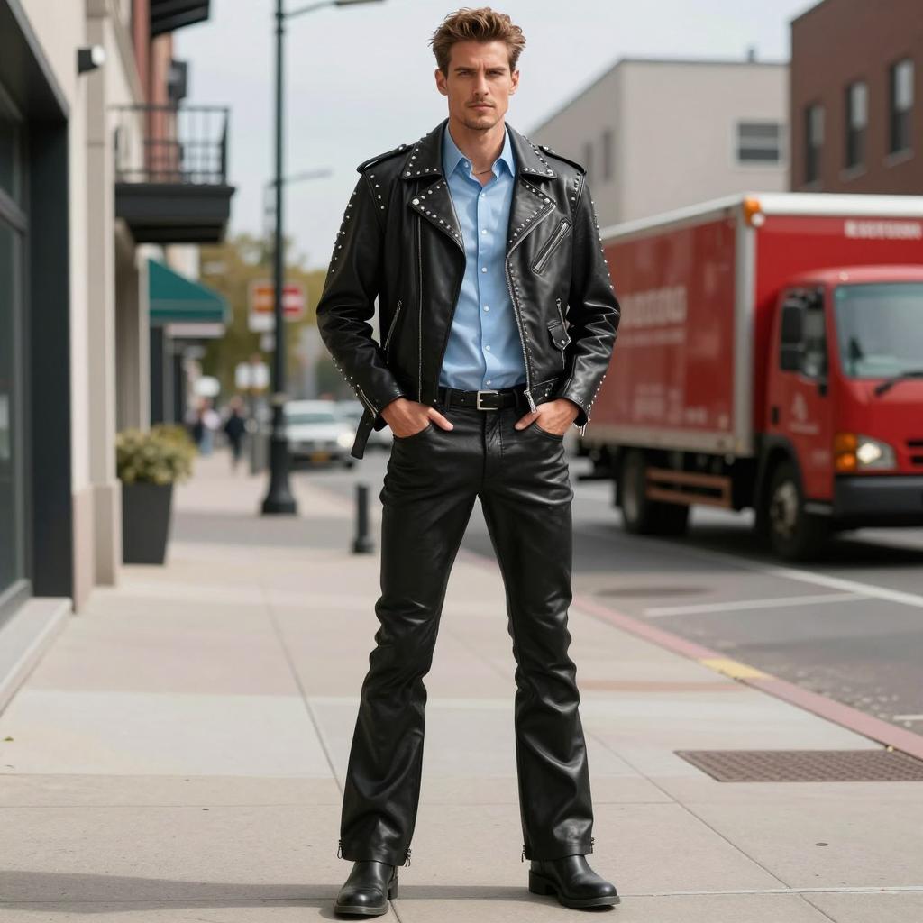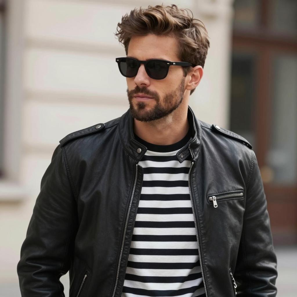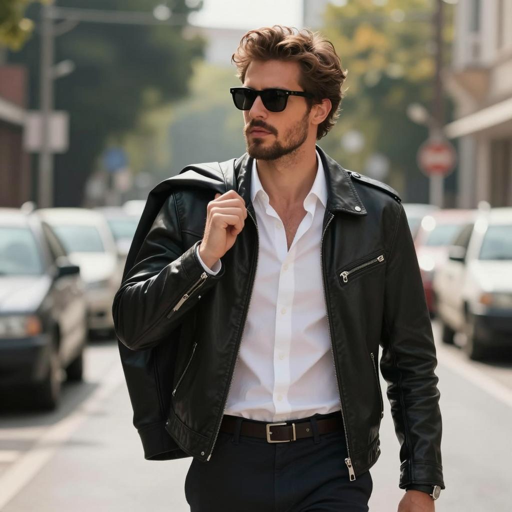Clubbing attire man costume, photorealistic portrait of a handsome man standing on a sunny street, wearing black sunglasses, black leather jacket, white dress shirt with top buttons undone, dark pants, brown hair styled up, beard, holding black jacket collar with right hand, wearing black watch on left wrist, blurred background with green trees and parked cars, daytime, confident expression, summer season, casual yet stylish, natural light