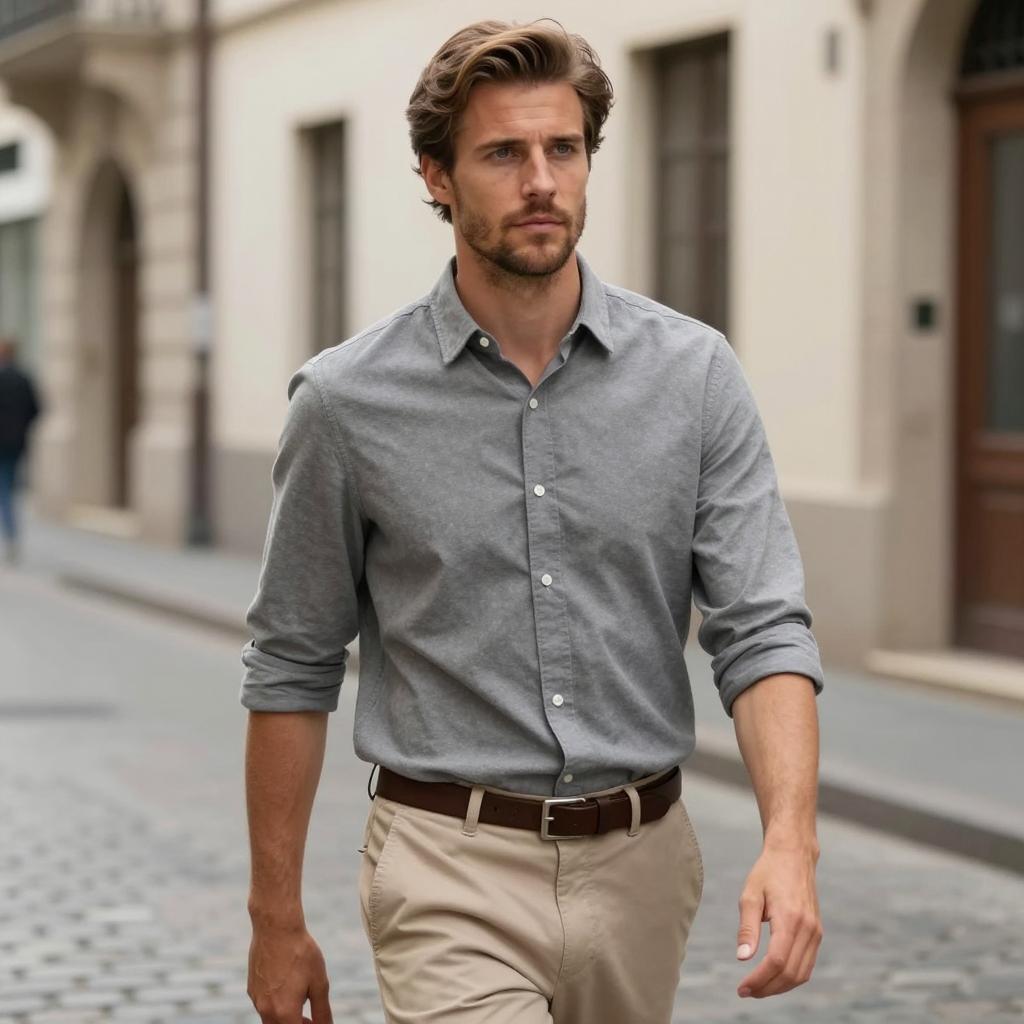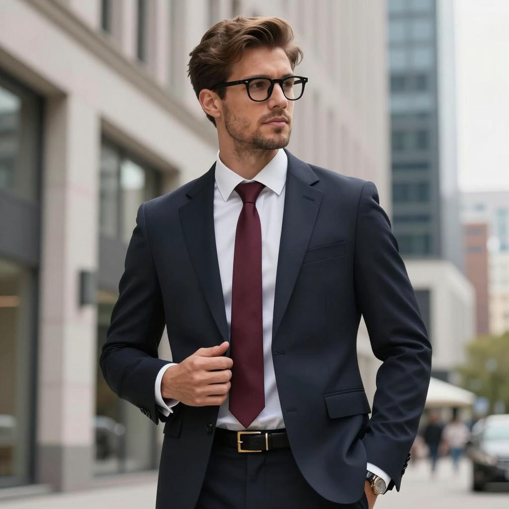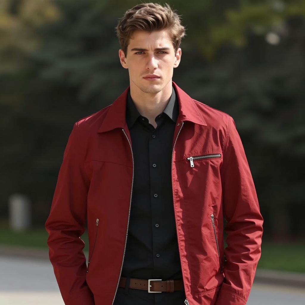 Clubbing attire man costume, photorealistic portrait of a handsome man standing on a sunny street, wearing black sunglasses, black leather jacket, white dress shirt with top buttons undone, dark pants, brown hair styled up, beard, holding black jacket collar with right hand, wearing black watch on left wrist, blurred background with green trees and parked cars, daytime, confident expression, summer season, casual yet stylish, natural light