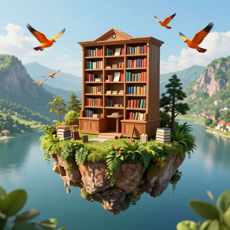 Digital illustration of a floating wooden library on a rocky island above a serene, mountainous lake. The library, with tall shelves filled with colorful books, has a triangular roof and is surrounded by lush greenery, including ferns and small trees. Four vibrant orange birds with black-tipped wings fly around the library. In the background, a clear blue sky, distant mountains, and a small village with red-roofed houses are visible. The image combines fantasy and realism, with detailed textures and bright, vivid colors.