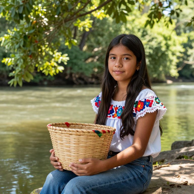 13 year old Mexican pretty girl sitting by a serene riverside with lush green trees, holding a handmade woven basket, soft sunlight filtering through leaves, her expressive face framed by long dark hair, wearing casual traditional attire, peaceful and vibrant scene