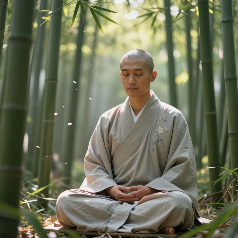 Gyatsu monk meditating peacefully in a serene bamboo forest, soft rays of sunlight filtering through leaves, calm and focused, wearing simple robes with subtle embroidery, delicate flower petals floating in the breeze, harmonious and tranquil composition.