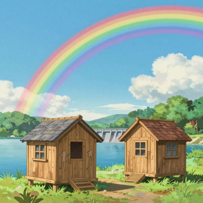 Keith Haring wood cabañas near a dam, studio ghibili, beautiful , peace, bright clouds, sunny, rainbow,