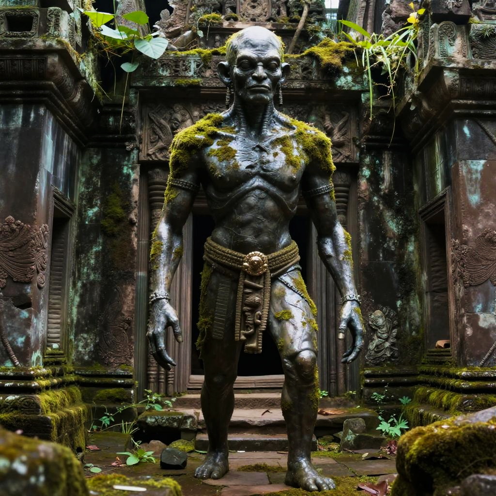 Dreamy forest canopy glowing with rust copper and faded denim, inhabited by ancient stone golems