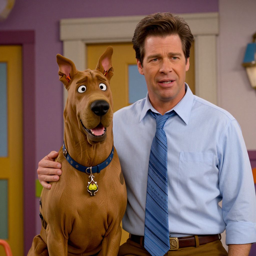 "Scooby Doo Scooby, image of a man with a dog in a tie"