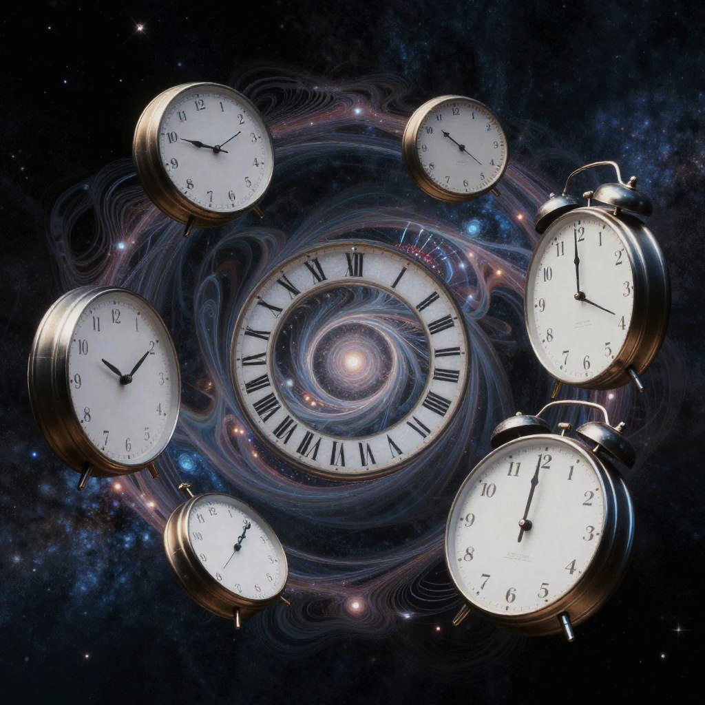 Conceptual representation of time as fragmented clocks and spirals intertwining in a cosmic space, with abstract patterns and glowing particles, evoking the fluid and nonlinear perception of past, present, and future.