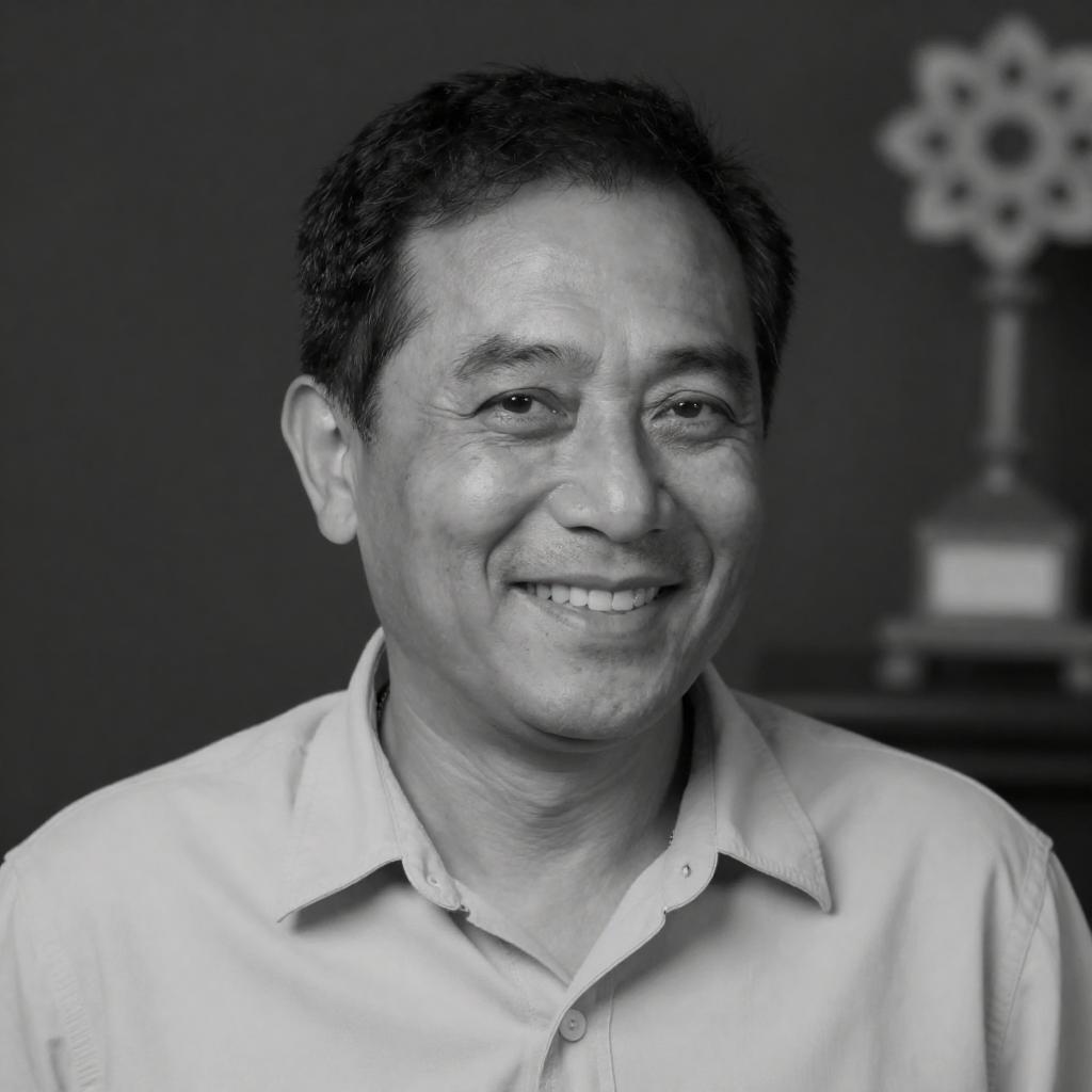 Black-and-white photograph of a smiling middle-aged man with short dark hair, wearing a collared shirt and a necklace. He is positioned slightly to the left, with a blurred decorative object in the background on the right. The image has high contrast, emphasizing his facial features and expression.