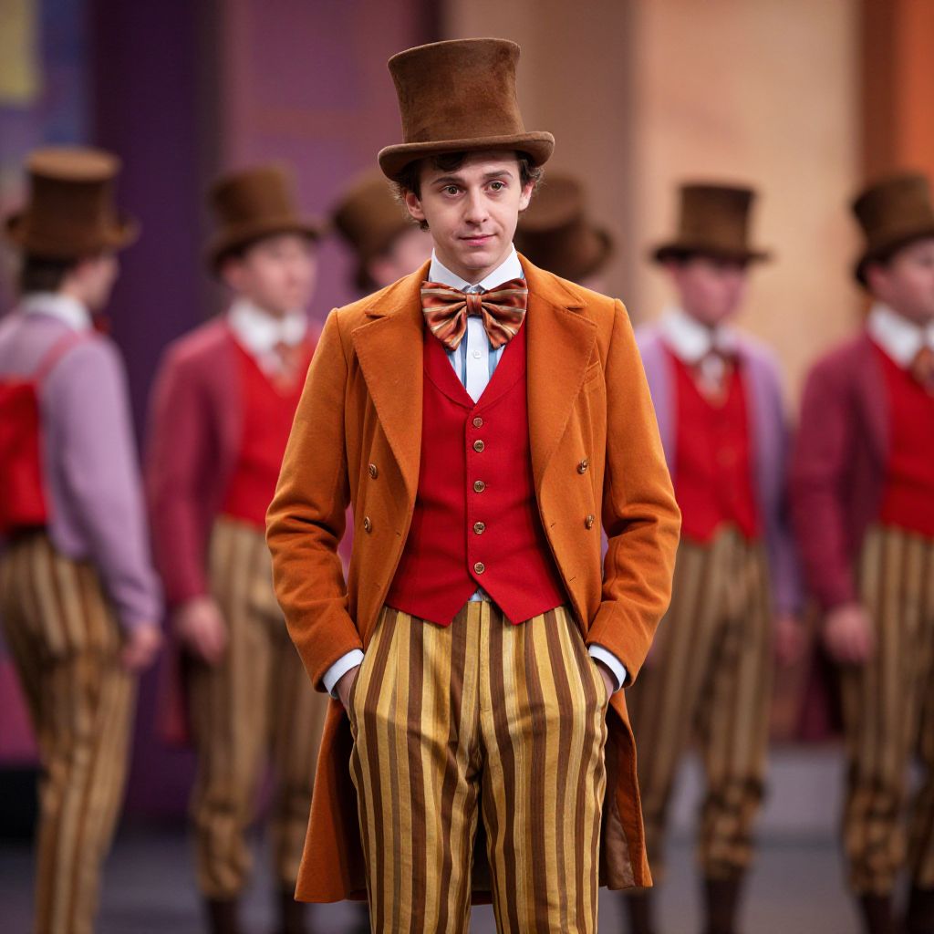 Willy wonka costume, hands in pockets, hat, top hat, male focus, pants, bow, bowtie, vest, striped pants, striped clothes, 1boy, jacket, shirt, coat, red vest, blurry, standing, multiple boys, long sleeves