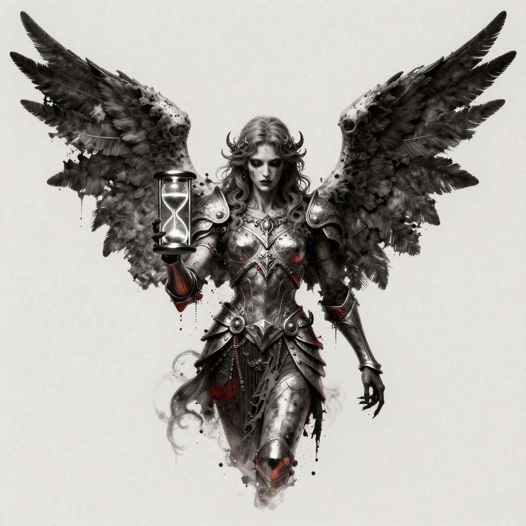 Dark angel of death tattoo concept featuring a serene but ominous figure with large tattered wings, intricate armor details, clutching a glowing hourglass, with subtle hints of red in the monochrome palette, evoking themes of mortality and time in a dramatic composition.