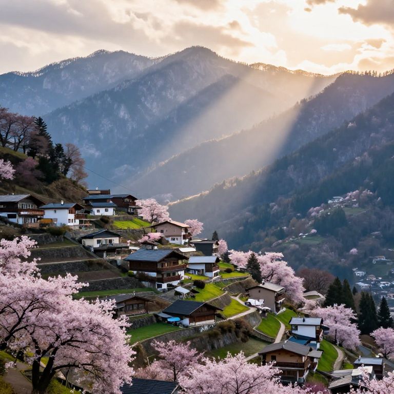 Outstanding high angle shot of a high mountain with houses on a down hill terraces, god rays, cherry blossom, rich colors, artistic photography,