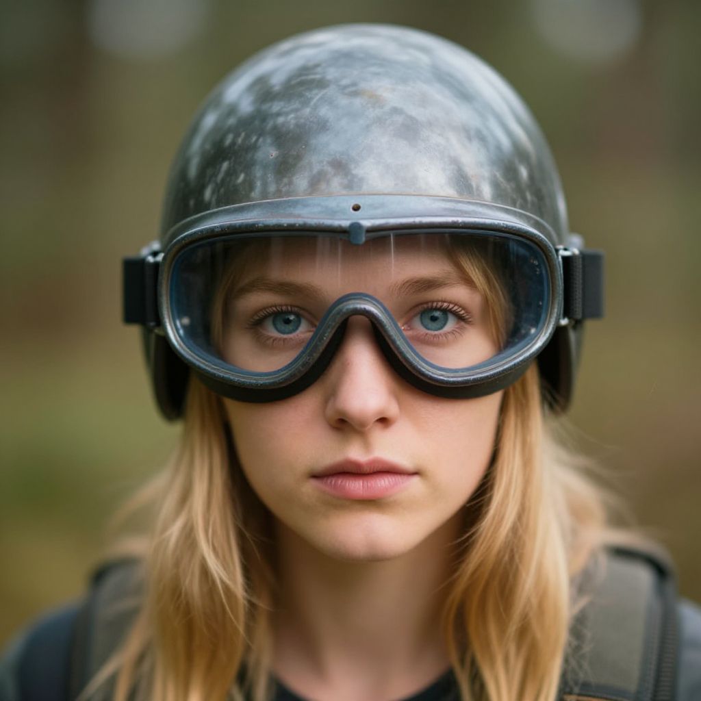 Hungry venus fly trap, solo, realistic, goggles, blurry background, blue eyes, blurry, blonde hair, 1girl, looking at viewer, helmet