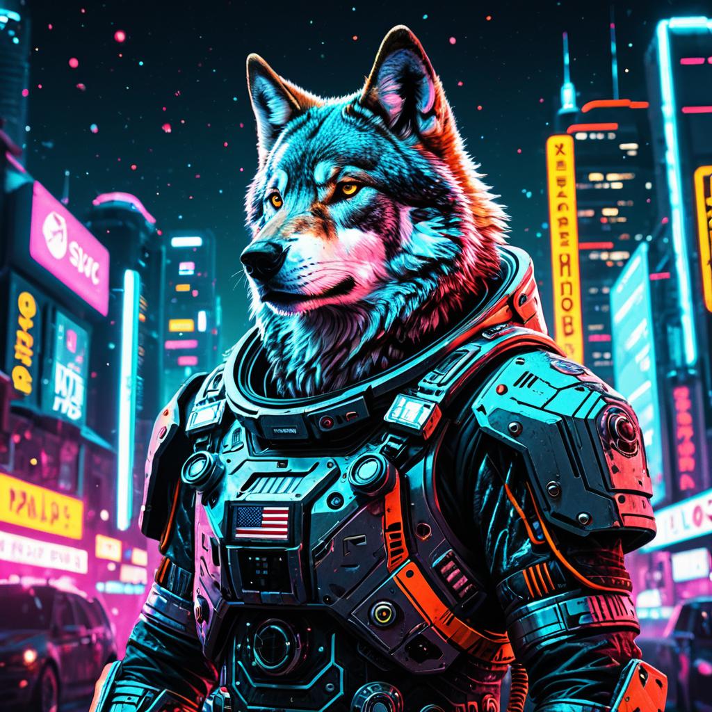 Highly detailed 8k illustration of a wolf wearing a spacesuit, with intricate armor detailing and cyberpunk aesthetic, set against a neon-lit cityscape. Realistic textures, vibrant colors, and a playful, sci-fi theme