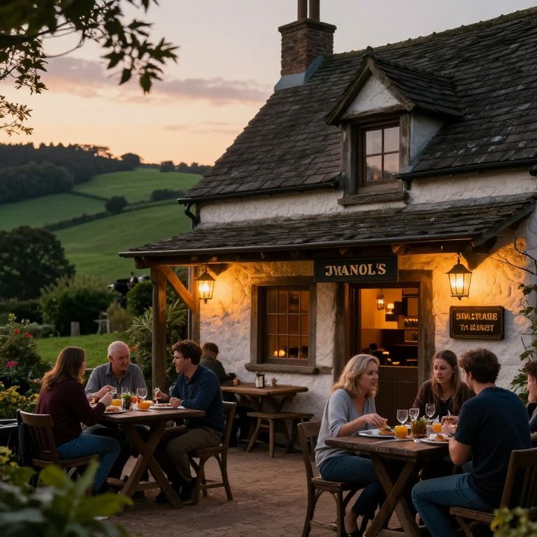 Arnold's quaint countryside tavern at sunset, rustic wooden beams, warm glowing lanterns, lush green surrounding hills, patrons enjoying hearty meals and laughter, vintage signs, cozy and inviting atmosphere, cinematic natural lighting, ultra realistic detail.