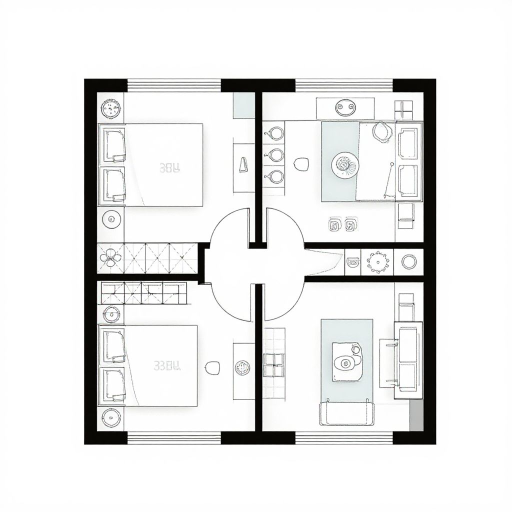 This is a black-and-white, digital floor plan drawing of a two-bedroom apartment. The layout is symmetric, with two identical bedrooms on the top left and top right, each containing a bed, nightstand, and a closet. In the center is a circular common area with a toilet and a sink. The bottom left and bottom right have living areas with a sofa, table, and chairs. The rooms are separated by thick black lines, and the walls are uniformly thick. The floor plan includes detailed line work to indicate furniture and fixtures.