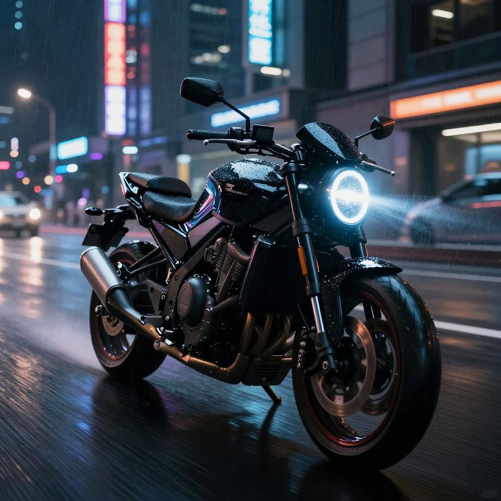 Batimobil speeding through a futuristic neon city at night, glowing blue lights reflecting off sleek black armor, dramatic rainstorm, cyberpunk aesthetic, highly detailed