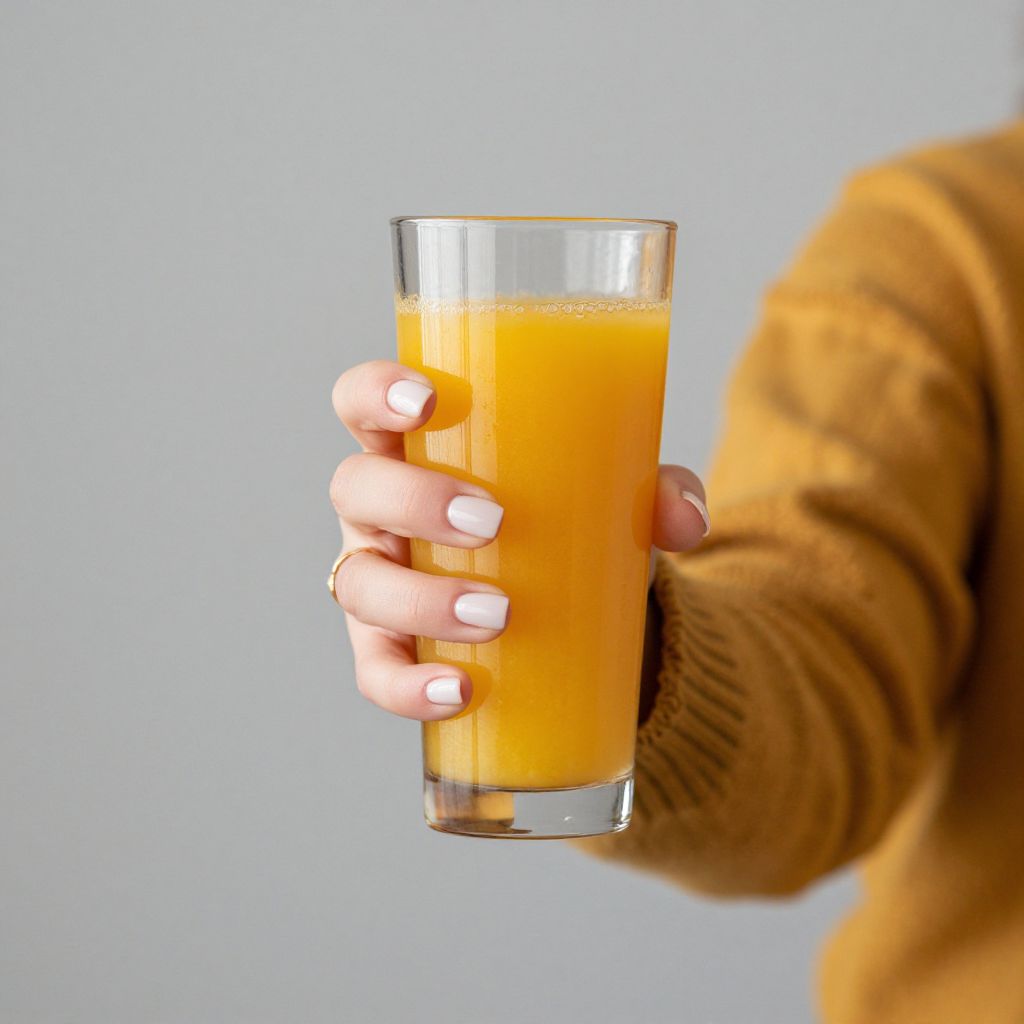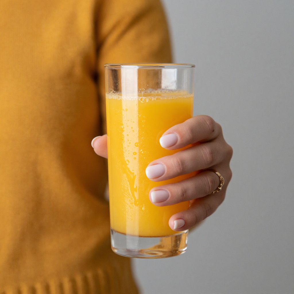 Woman extending a hand holding a tall glass filled with vibrant orange juice, showcasing neatly manicured nails and a gold ring, while wearing a mustard-yellow sweater against a neutral background.