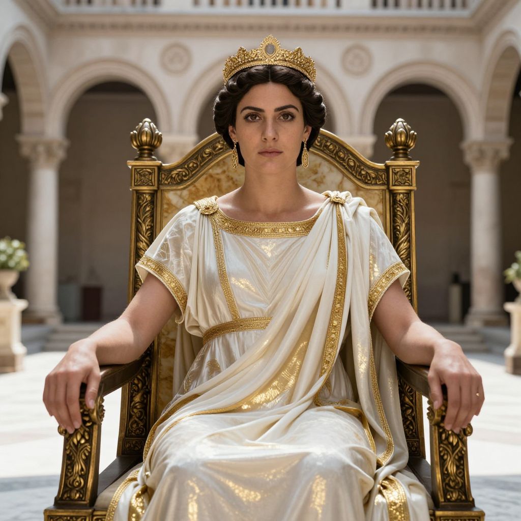 Photograph of a woman with olive skin and dark curly hair, wearing a golden crown and white toga with gold trim, seated on an ornate, gold-accented throne. She has a serious expression and is positioned in the center of a sunlit, classical-style courtyard with arched columns and potted plants in the background. The toga's fabric is shiny and smooth, while the throne has intricate carvings. The setting suggests a historical or mythological theme. The lighting highlights the golden details and her regal attire, emphasizing her authoritative presence.
