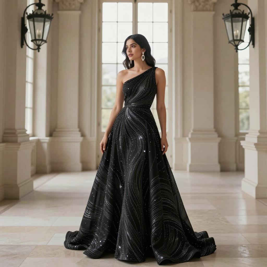 Photograph of a tall, slender woman with long black hair, wearing a sparkling black evening gown with a deep V-neck and thigh-high slit. She holds a glittery clutch in her right hand and stands confidently in a grand, elegant hall with marble floors and tall, ornate columns in the background.