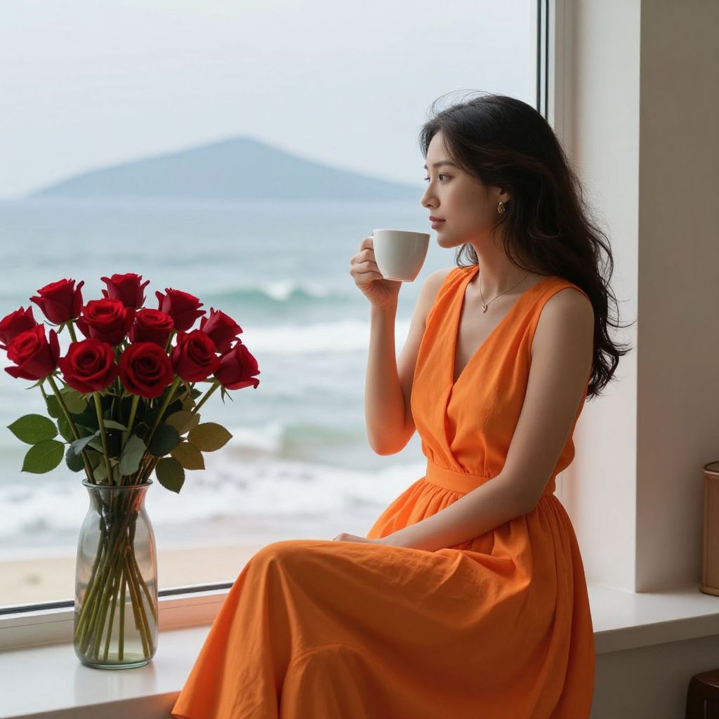 Elegant woman in a vibrant orange dress sits gracefully by a window, sipping coffee while gazing out at a serene seascape featuring rolling waves, distant mountains, and a vase of vivid red roses placed beside her on the windowsill.