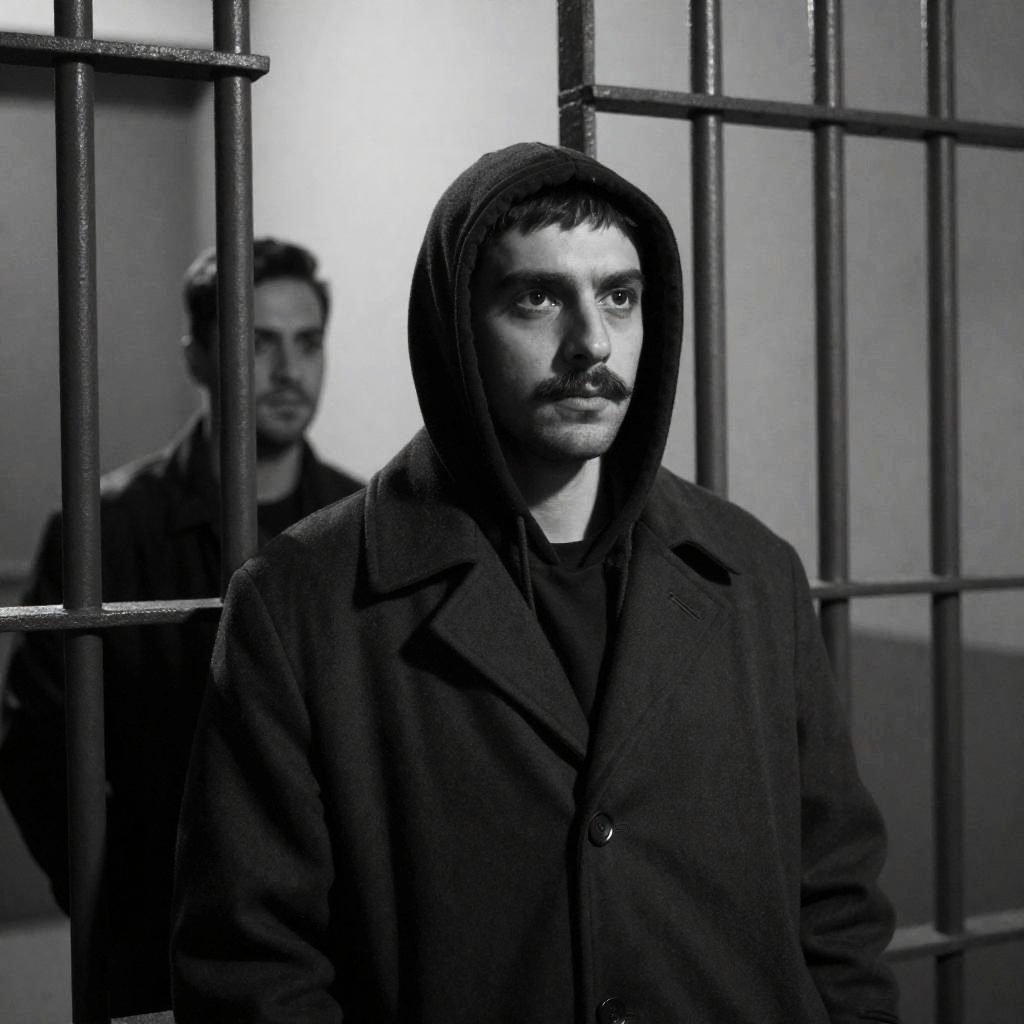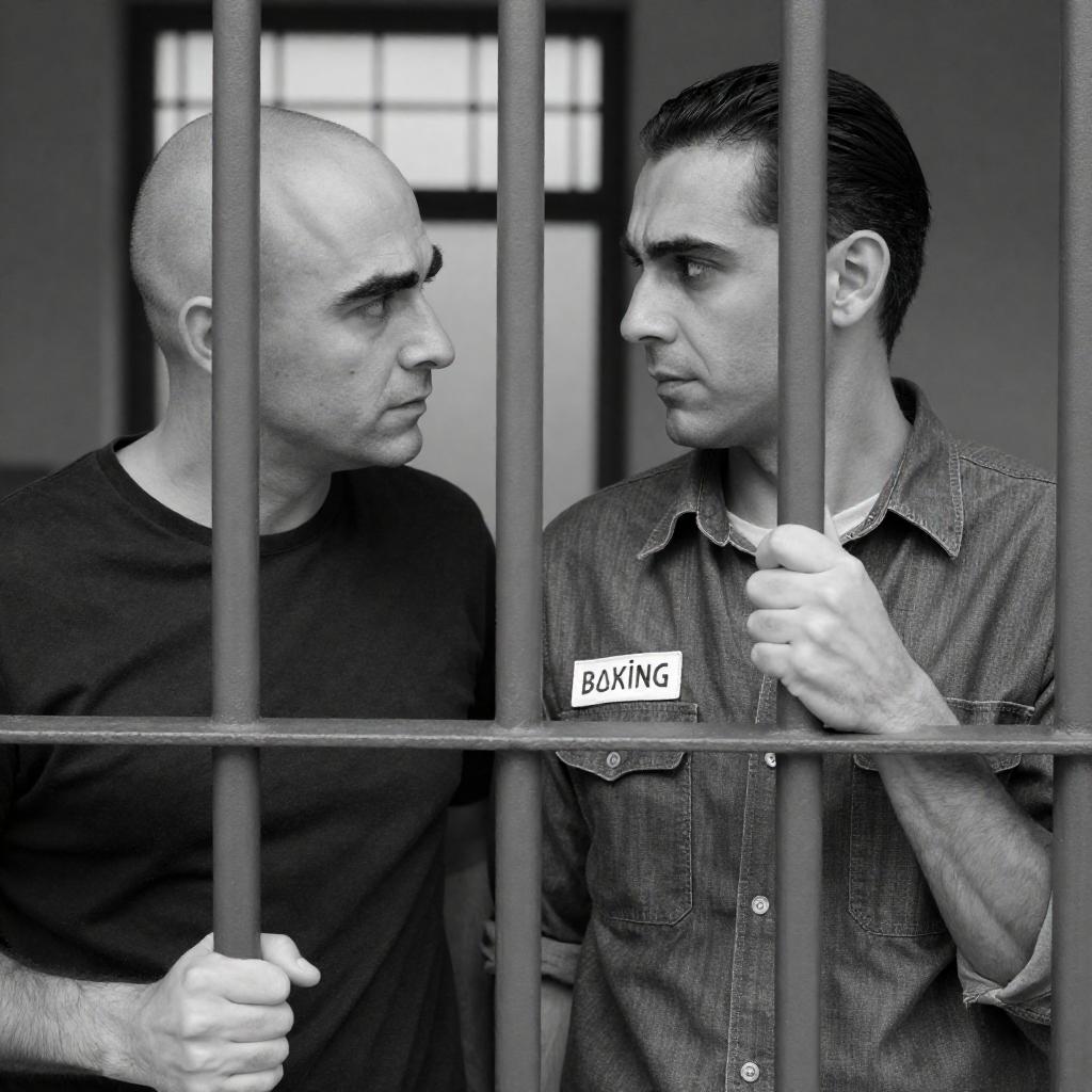 Black and white photograph of three men in a prison corridor. Two men in the background, one standing, one kneeling, embracing. Foreground man on the floor, arms outstretched. Metal bars on both sides, grid ceiling, dim lighting.