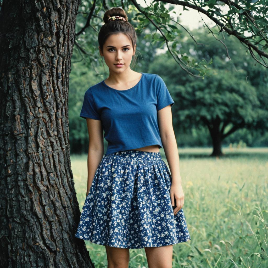 Young Woman in Blue Floral Skirt Outdoors