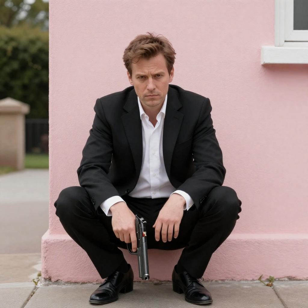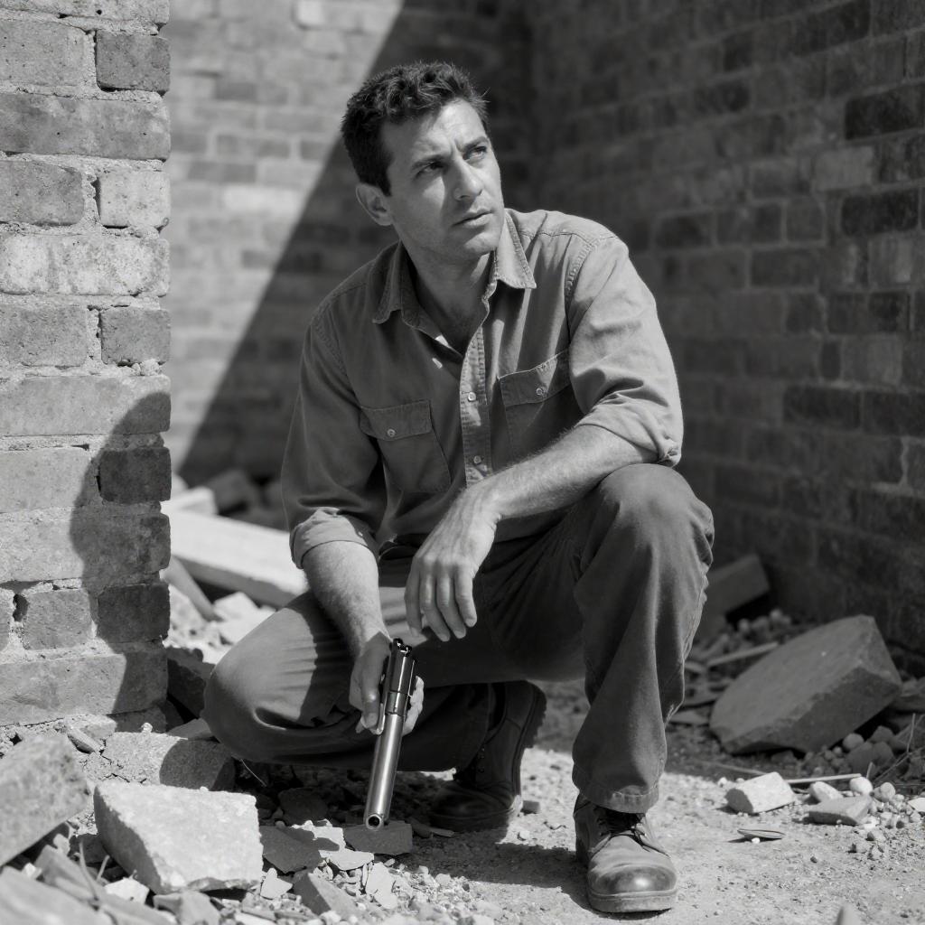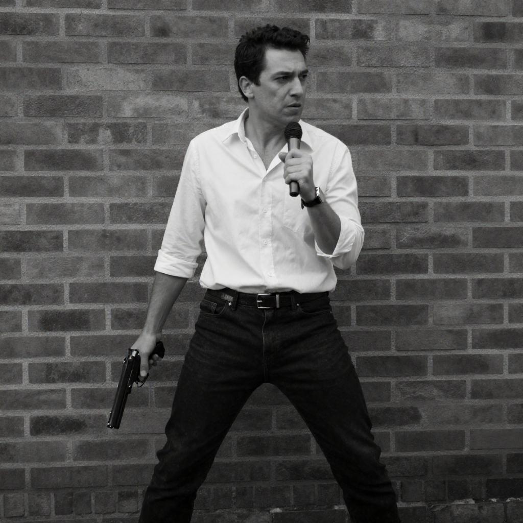 Black-and-white photograph of a man in a white shirt and dark pants, standing against a brick wall, holding a gun in his right hand and a microphone in his left. He is mid-motion, with a serious expression, leaning slightly to the right. The brick wall is ured and uneven, adding a gritty atmosphere to the scene.