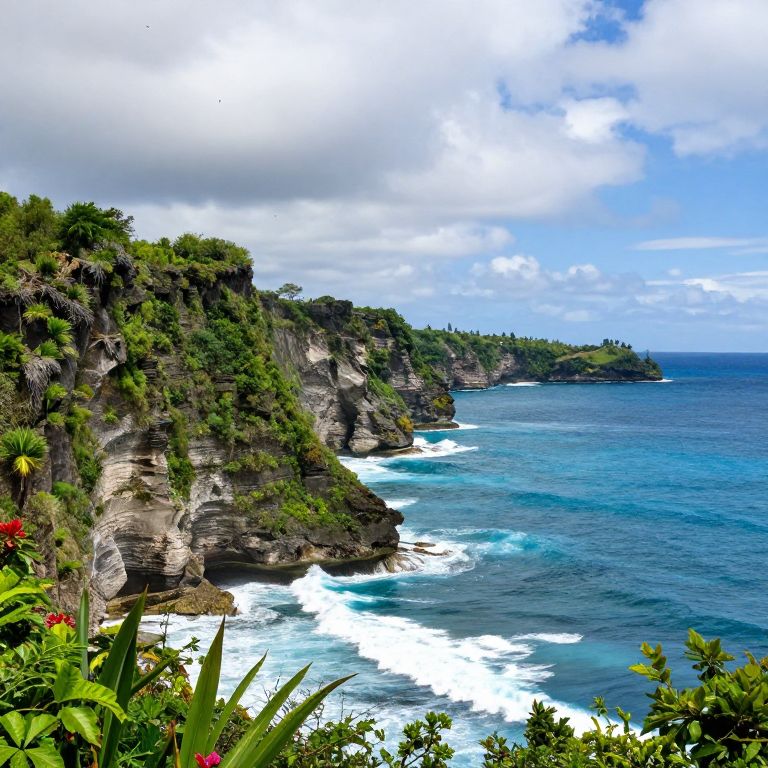 Negril cliffs overlooking the Caribbean Sea, rugged rock formations covered with lush green vegetation, bright blue ocean waves crashing peacefully below, dramatic sky with soft clouds, vibrant flora around the cliff edges, tropical birds flying above