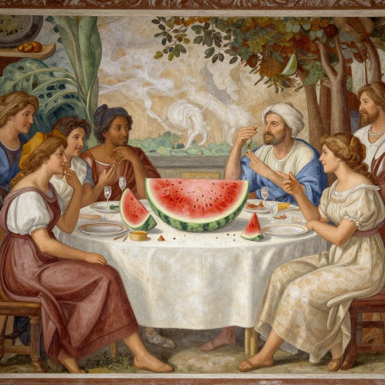 Watermelon painting renaissance inspired, a fresco scene of a summer feast with watermelon centerpiece, delicately rendered figures in period clothing, soft natural lighting, muted earth tones