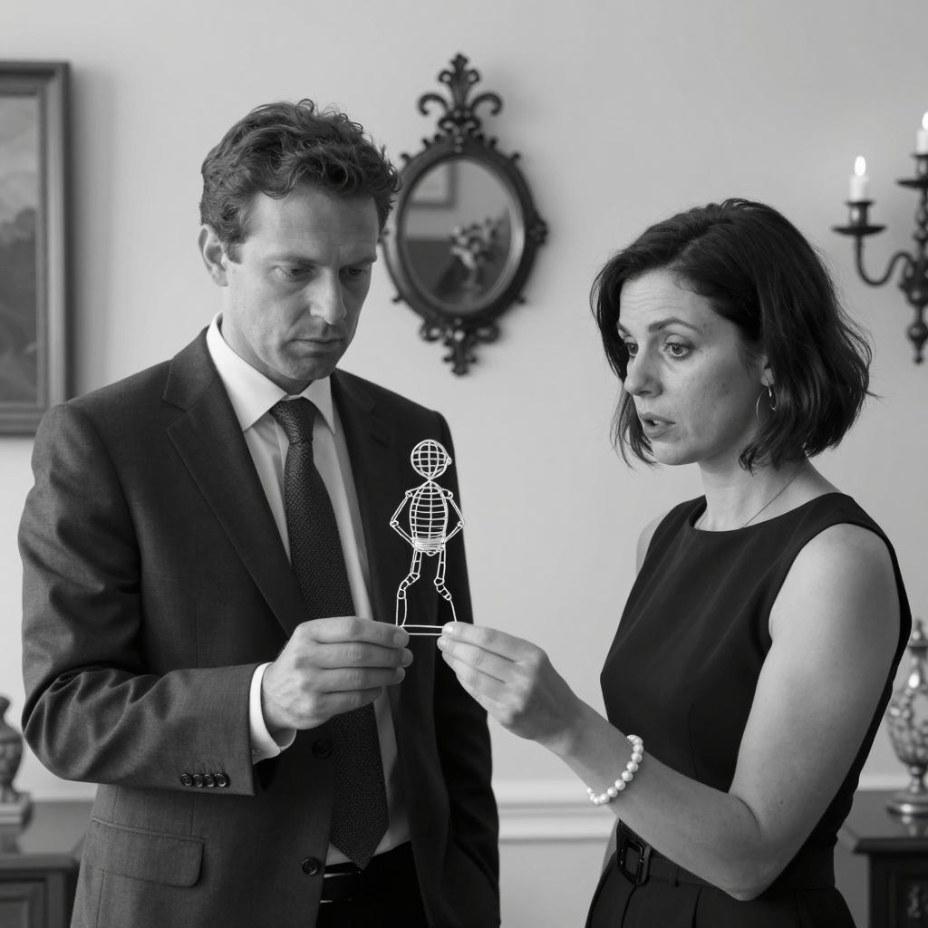 Black-and-white photograph of a man and woman in a social setting. Man in suit, short dark hair, smiling, hand near chin. Woman in short-sleeved blouse, dark hair in bun, smiling, gesturing with hands. Blurred background with people and framed picture. Man on left, woman on right.