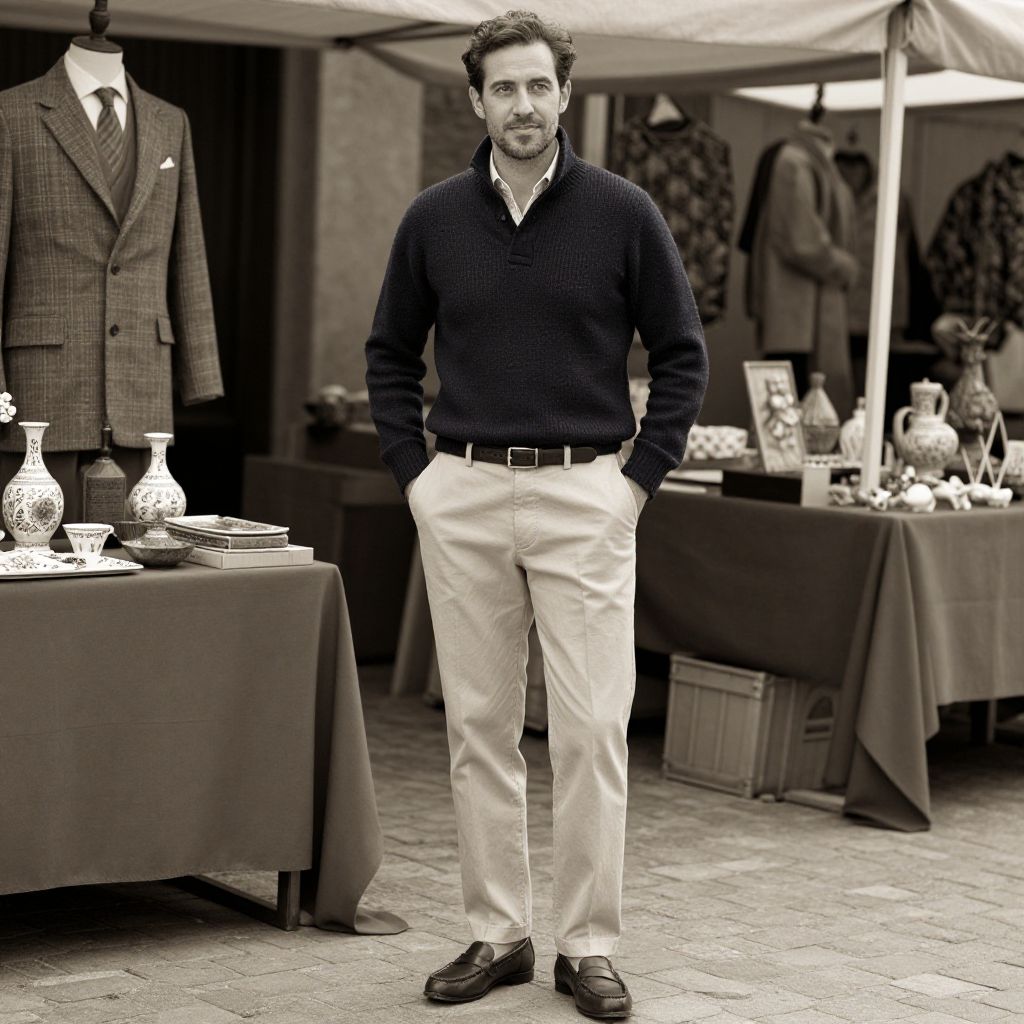 A man, navy merino wool knit sweater, beige cotton chinos, brown leather loafers, matching brown leather belt, artisan craft stalls, sepia effect, relaxed pose, slight smile, hands in pockets.Man has masculine face and piercing eyes