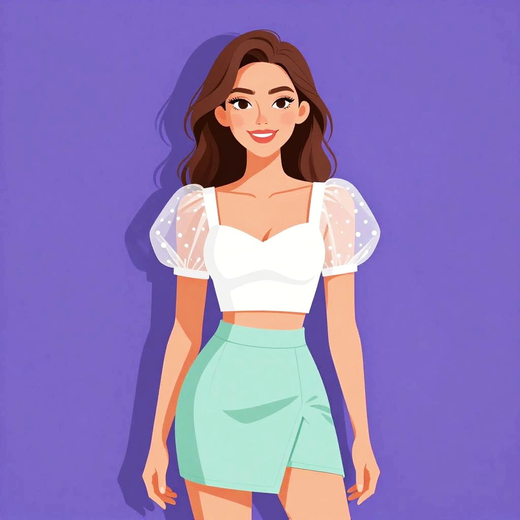 Illustration of a smiling woman with brown hair, wearing a contemporary chic outfit. She is dressed in a white crop top featuring sheer polka dot puff sleeves and a scoop neckline, paired with a high-waisted mint green asymmetrical mini skirt. The background is a solid purple studio setting.