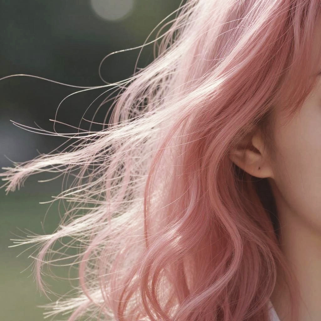 Close-up of pink curly hair blowing in the wind, natural outdoor scene, sunlight filtering through strands, soft bokeh background, delicate and airy feel