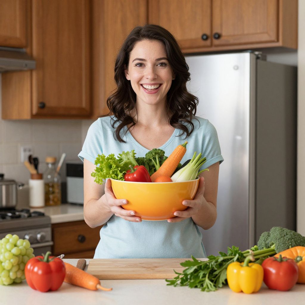 Photograph of a smiling woman with long, wavy dark brown hair, wearing a light blue short-sleeved shirt, standing in a modern kitchen. She holds an orange bowl filled with fresh vegetables including carrots, broccoli, lettuce, and tomatoes. The kitchen has wooden cabinets, a stainless steel refrigerator, and a stovetop with kitchen utensils. The countertop in the foreground displays a variety of colorful vegetables including red tomatoes, yellow bell peppers, green grapes, and an orange carrot. The woman's cheerful expression and the vibrant colors create a lively, healthy atmosphere.
