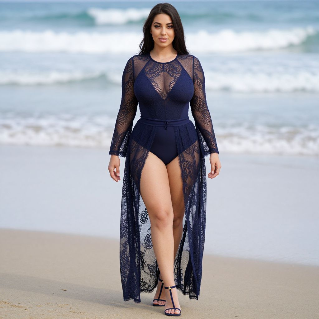 Full body shot, Pear-shaped body type woman, long sleeve swimsuit, deep navy blue, sleek, stretchy fabric, high neckline, modest cut, intricate lace cover-up, sheer, flowing, delicate floral patterns, lightweight, ankle-length, open front, cinched waist, matching navy blue sandals, minimalistic jewelry, subtle gold accents, beach setting, soft sunlight, gentle waves in background Sexy. Pretty face and beаutiful eyes. Big breasts