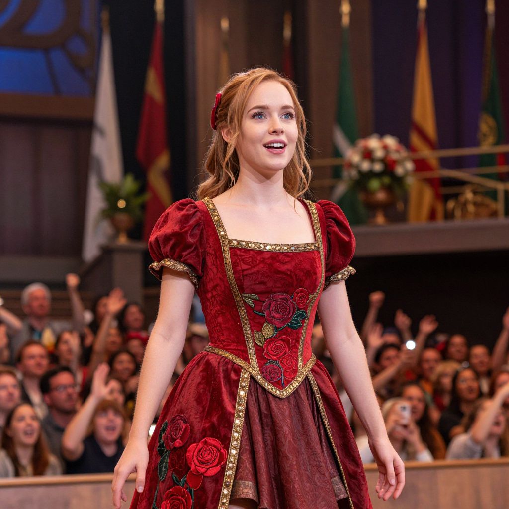 Photograph of a young white woman with light skin and long, wavy, blonde hair, dressed in a deep red, Victorian-style dress with puffed sleeves and gold trim. The dress features embroidered red roses and green leaves. She has a red rose hair accessory and is smiling brightly. The background shows a theater audience, with many people clapping and cheering. Flags and flowers are visible on a balcony above. The image is brightly lit, highlighting the subject and creating a festive, theatrical atmosphere.