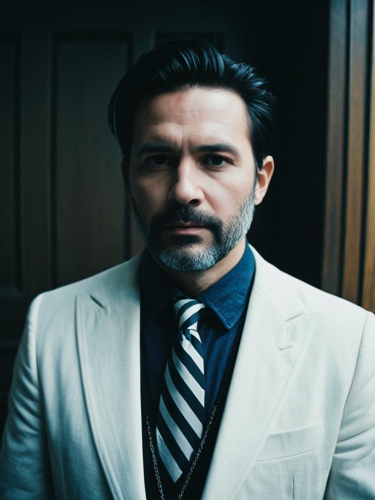 Portrait of a man dressed in cosplay inspired by Anya Forger, featuring a dark jacket with white trim, a red tie, white shirt, and vest. The man has medium-length dark hair and is posing with one finger raised against a tiled background, conveying a confident and playful demeanor.