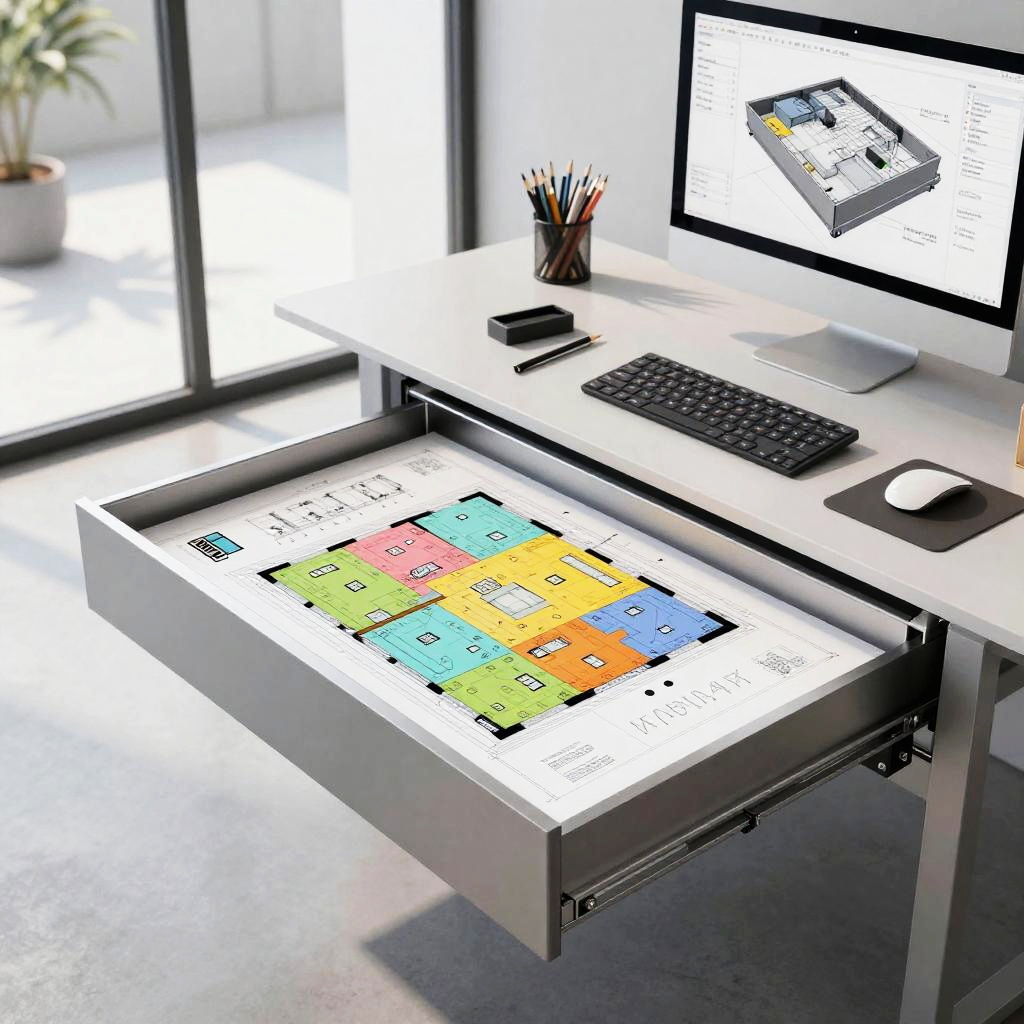 Floorplan drawer in a contemporary office setting, sleek metal drawer open with colorful architectural floorplans inside, surrounded by a high-tech drafting table, sketching tools, computer screen displaying 3D models, bright daylight through glass walls, futuristic style