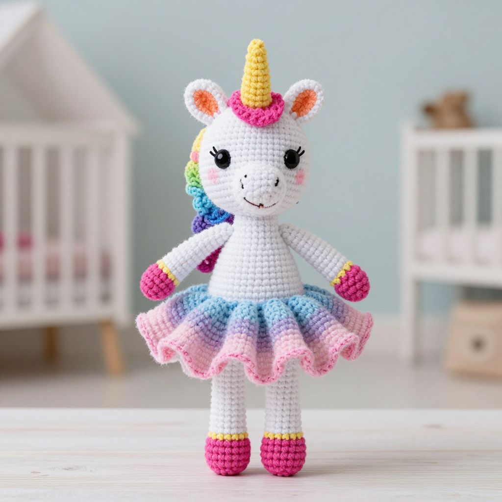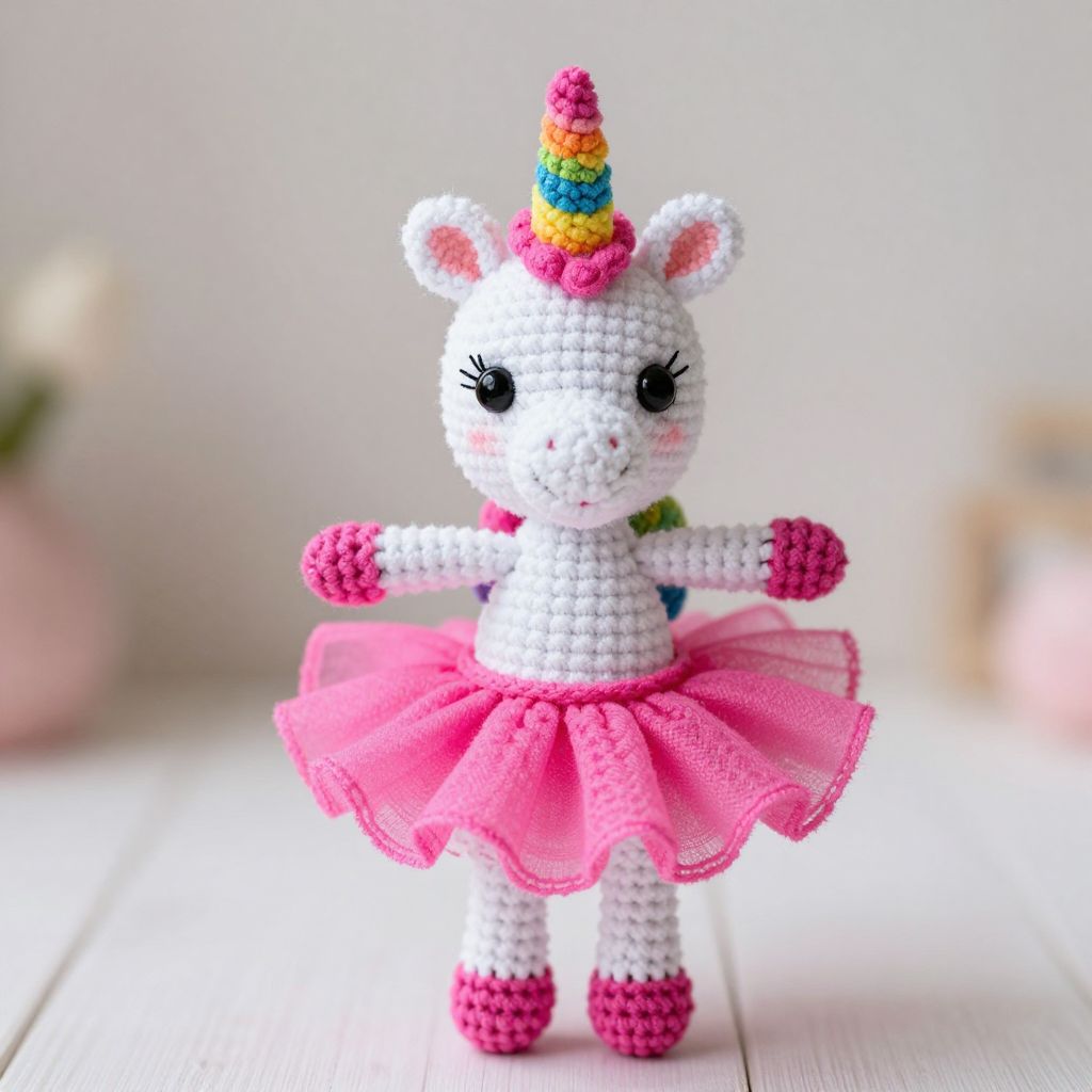 An enchanting crochet unicorn doll, adorned in a tutu ballerina dress, radiates whimsical joy and imaginative wonder, inviting young hearts into a world of boundless creativity and magical dreams.