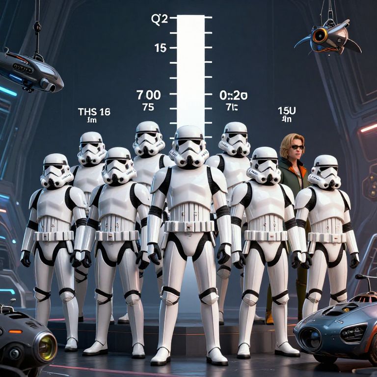 Digital CGI image featuring seven white Stormtroopers standing in a row, with a height meter in the background showing their varying heights. To the right, a blonde woman in a black and red outfit stands next to the meter. The background includes futuristic, blue-lit technology and two hovering vehicles. The Stormtroopers are uniformly white with black armor details, and the woman wears sunglasses. The overall style is reminiscent of the Star Wars franchise, with a modern, sci-fi aesthetic. The height meter displays values ranging from 7.00 to 15.00.