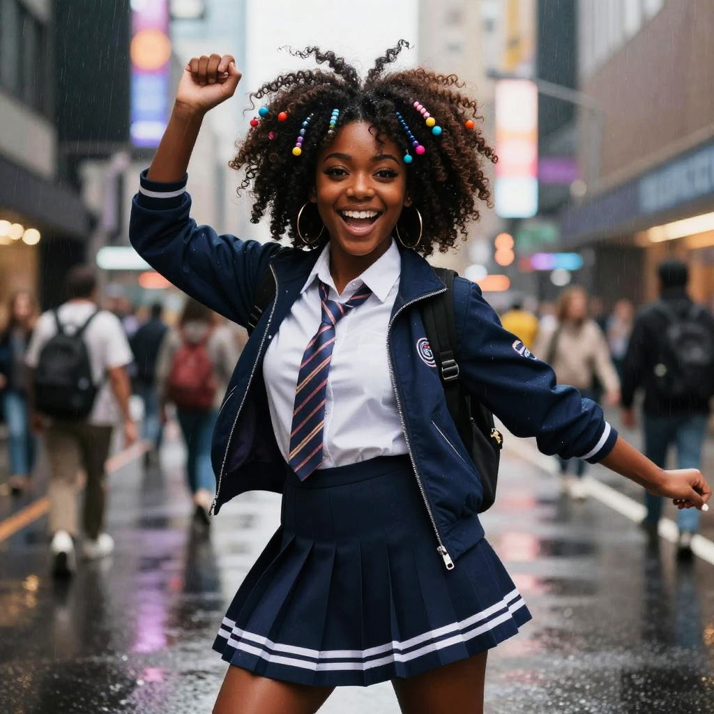Pretty black girl anime with natural afro hairstyle adorned with colorful beads, dressed in a stylish school uniform with a unique sci-fi twist, lively background of a bustling city street, rain droplets reflecting city lights, dynamic and energetic pose.