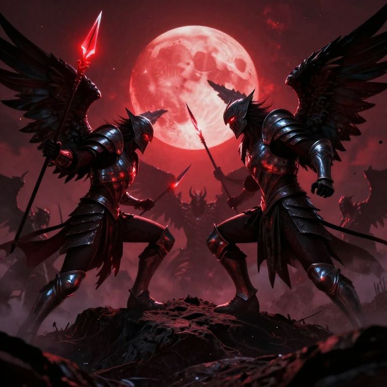Digital art: Epic battle scene with two towering, armored, winged demons flanking a central, explosive confrontation between a silhouetted warrior and