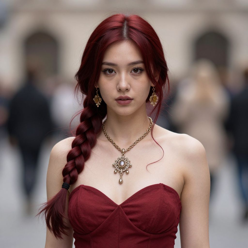 Deep red lace front, 1girl, solo, red hair, jewelry, necklace, long hair, looking at viewer, breasts, dress, blurry, blurry background, bare shoulders, braid, earrings, flower, upper body, medium breasts