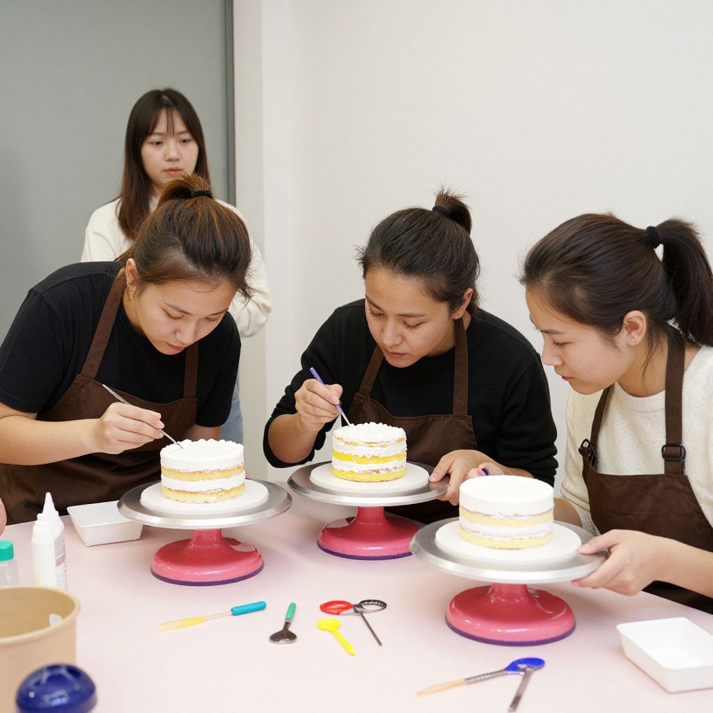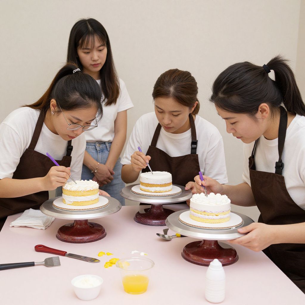 Three women in aprons focus intently on decorating cakes, each working on a small, layered cake covered in white frosting, while a fourth woman observes from behind, all seated around a light pink table with various decorating tools and ingredients laid out.
