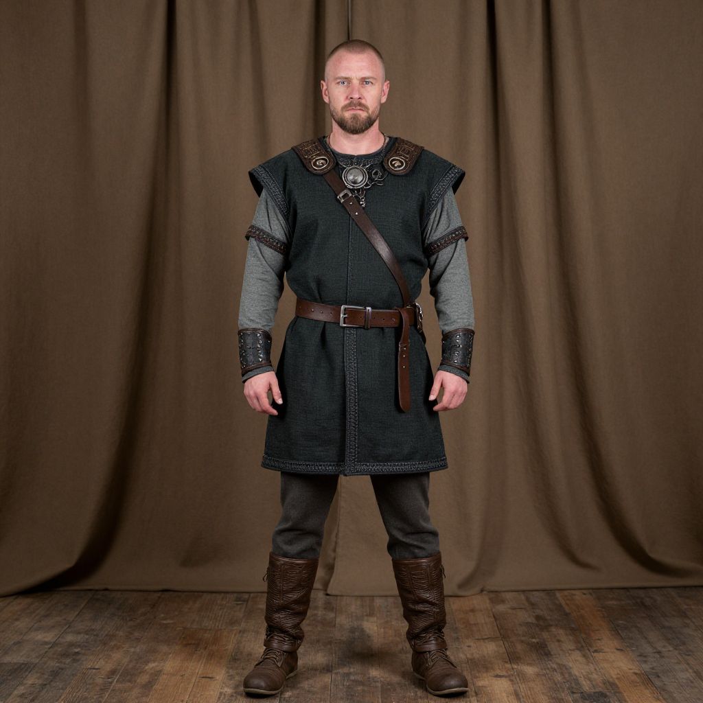 Photograph of a bald, bearded white man standing in front of a brown draped backdrop. He wears a medieval-style outfit with a black, knee-length tunic featuring intricate silver patterns on the shoulders and sleeves, over a gray long-sleeve shirt. A brown leather belt with a strap crosses his chest. His dark brown boots are laced up. The floor is wooden with a subtle pattern. His expression is neutral, and he stands with his hands by his sides, centered in the image. The lighting is even, highlighting the textures of his clothing.